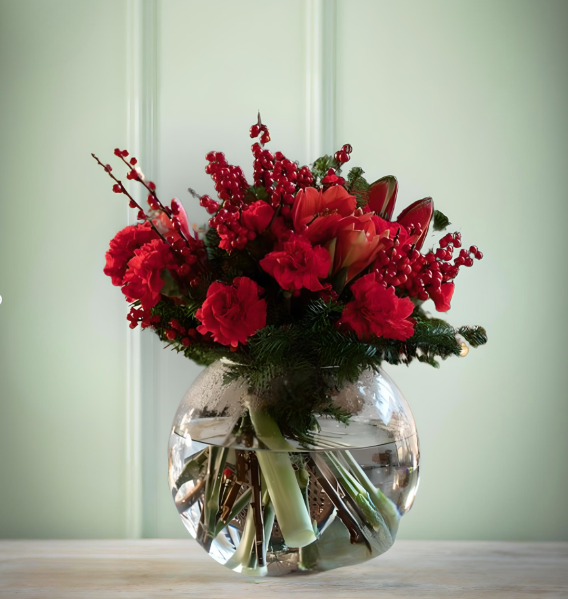Composición alegórica a la navidad con claveles rojos e ilex , acompañados de verdes navideños